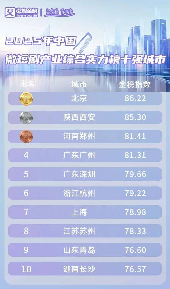 近期,艾媒咨询旗下iiMedia Ranking(艾媒金榜)发布《2025年中国微短剧产业综合实力榜十强城市》。榜单显示,北京、陕西西安、河南郑州位列全国三甲,而广东的广州和深圳分别占据第四和第五位,成为华南地区微短剧产业发展的双引擎。