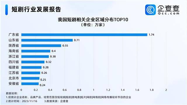 视野再放大一点,除了广州深圳,整个广东的微短剧产业都很强劲。企查查数据显示,广东短剧相关企业存量过万,居全国第一。
