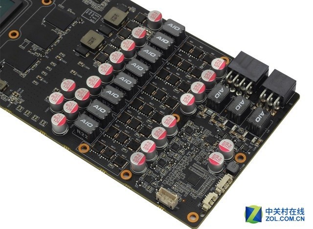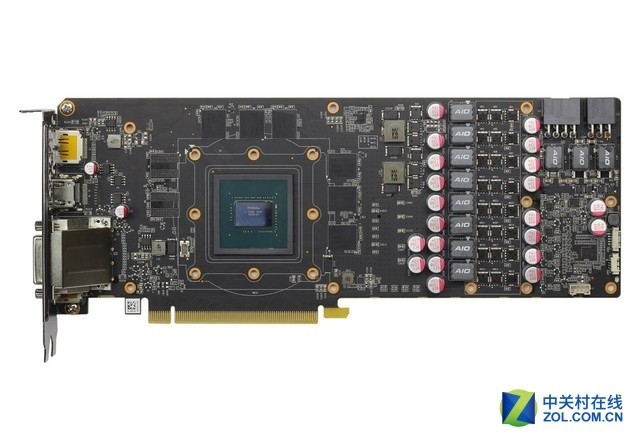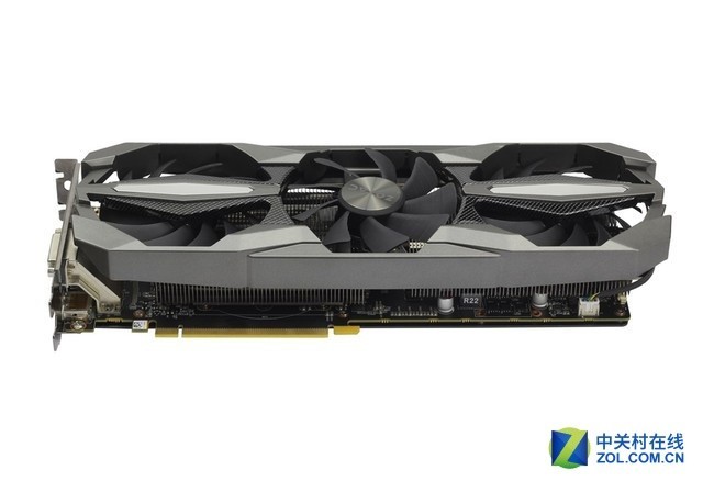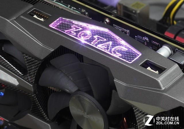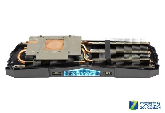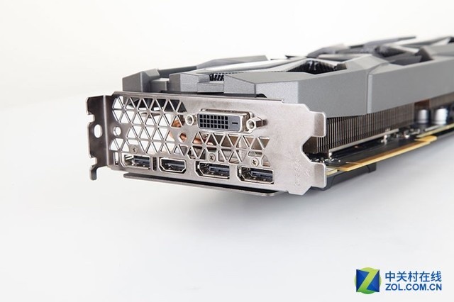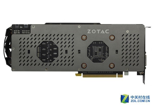 显卡背面采用的是合金背板,灰黑色的磨砂金属背板,手感极好,明显看到显卡背板GPU和供电部分大面积镂空,这其实就是安装索泰独家的背板风扇“3D-Storm立体散热引擎”的位置。