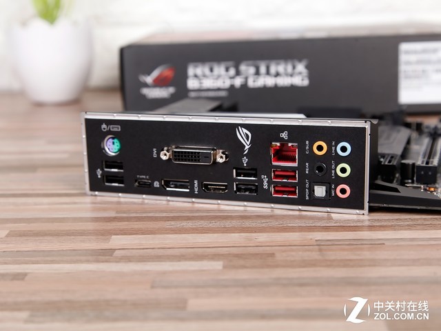 背板部分,该产品采用了以往只有ROG高端系列产品中才使用的一体化背板设计,不仅带有丰富的视频接口,同时基于B360芯片组的新特征,还为用户提供了原生USB3.1Gen2高速接口。网络部分搭载了Intel1219V高速千兆网卡,配合华硕独有的ROGGameFirstIV及LANGuard能够确保网络环境的稳定。