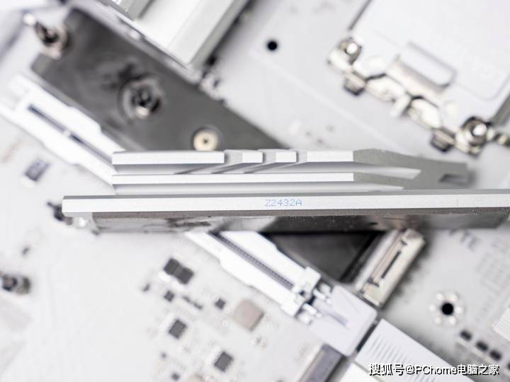 Z890电竞冰雕提供5组M.2 SSD插槽,其中两组是CPU直连的,其中一个支持PCI-E 5.0x4通道,覆盖厚实的散热装甲,不规则的鳍片散热面积更大,大家比较担心的PCIe 5.0固态硬盘发热大的状况可以得到缓解。一个细节是M.2插槽还配备了抗干扰金属遮罩,提高抗干扰能力。