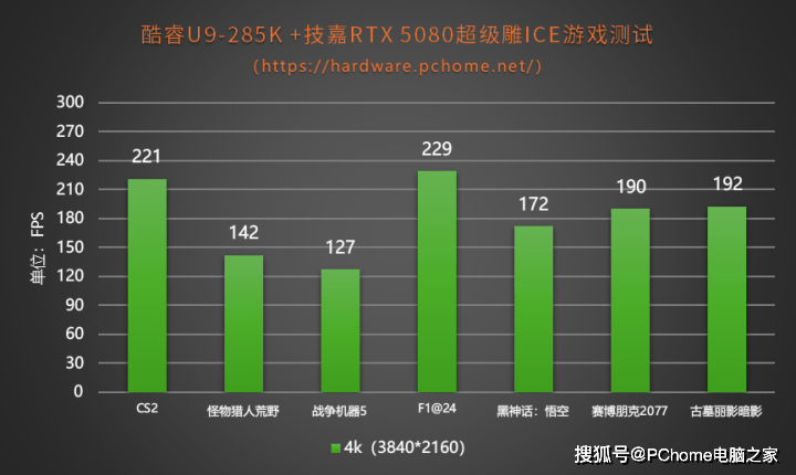 其实对于RTX 5080这种规格的显卡,再加上DLSS 4多帧生成黑科技,完全不用担心游戏不能玩或是帧率不够什么的。1080P和2K分辨率已然没有必要测试,我们直接从4K分辨率、最高画质、开启光线追踪、DLSS性能档的设定下(如游戏支持则开启4x帧生成),简单测试了《CS2》《怪物猎人荒野》《黑神话:悟空》《古墓丽影:暗影》《F1@24》《赛博朋克2077》《战争机器5》等几款具有代表性的游戏。