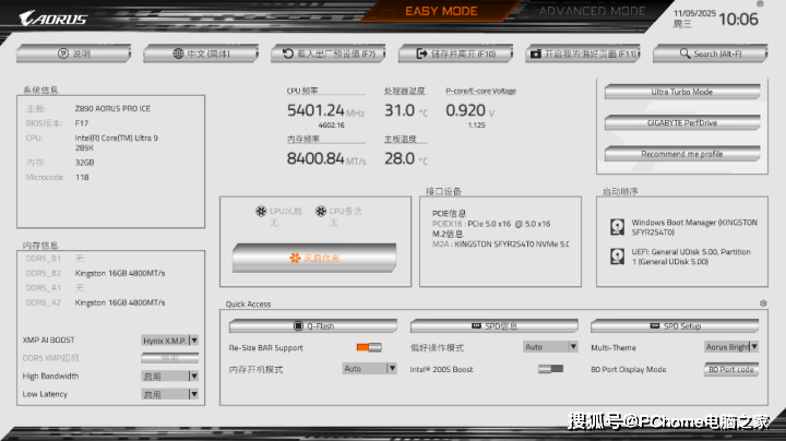 最后,我们还要谈谈技嘉Z890电竞冰雕在体验方面的进步,其实这不仅是这一款主板,也是这几年技嘉着重发力的点之一。现在消费者对于电子产品的要求愈发苛刻,想要抓住用户易用的体验是必修课。Z890电竞冰雕的改进从BIOS界面开始,键鼠支持自不必说,精心设计的全新UI,美观大方,功能分区清晰易用,即使你没怎么接触过电脑也很容易上手。
