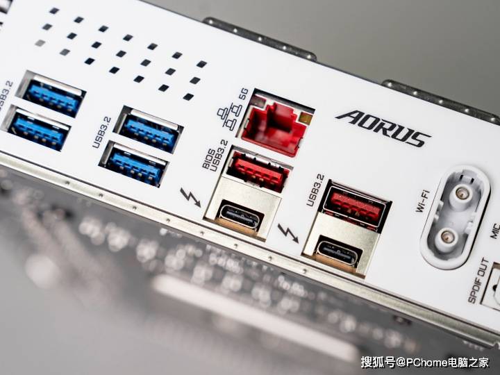 背部I/O接口方面,Z890电竞冰雕配备双USB-C雷电4接口,支持DP视频输出。另有四个USB 3.2 Gen1(蓝色)和2个USB 3.2 Gen2(红色)。网络方面,新一代WiFi 7定向超高增益天线GHz无线频段,增加了网络带宽上限,有线Gbps的Realtek自适应网卡。