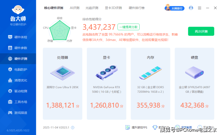 整机性能方面,毫无疑问的这是一套高端旗舰平台,在某大师评分中轻松跑到343万分,已然超越了全国99%的电脑。其中处理器138万分,显卡126万分,内存35万分,硬盘43万分,综合实力毋庸置疑。