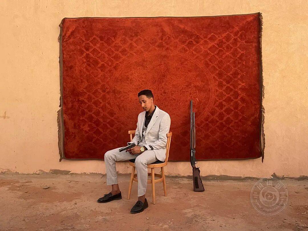 2024 年1月12日,新郎在婚礼上拍照。在苏丹,用鸣枪庆祝宣布婚礼是一项传统。这张照片是用手机相机拍摄的。苏丹,乌姆杜尔曼。