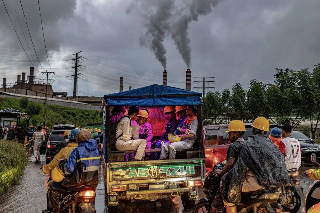 2024 年8月12日,持续两天的暴雨导致洪水泛滥,工人们乘车前往一家镍冶炼加工厂。印度尼西亚哈尔马赫拉岛韦达。