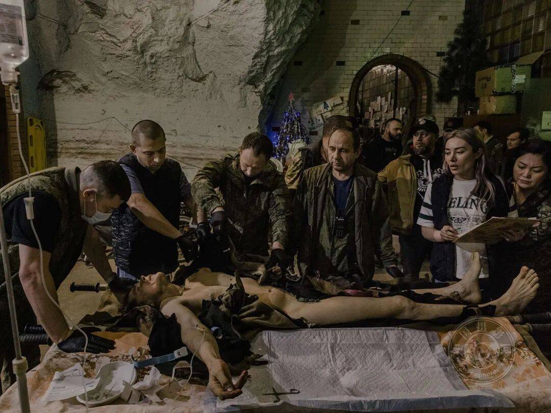 2024年1月22日,一名在巴赫穆特市附近受伤的士兵躺在地下酒厂的战地医院里。他的左腿和左臂后来被截肢。乌克兰,顿巴斯。