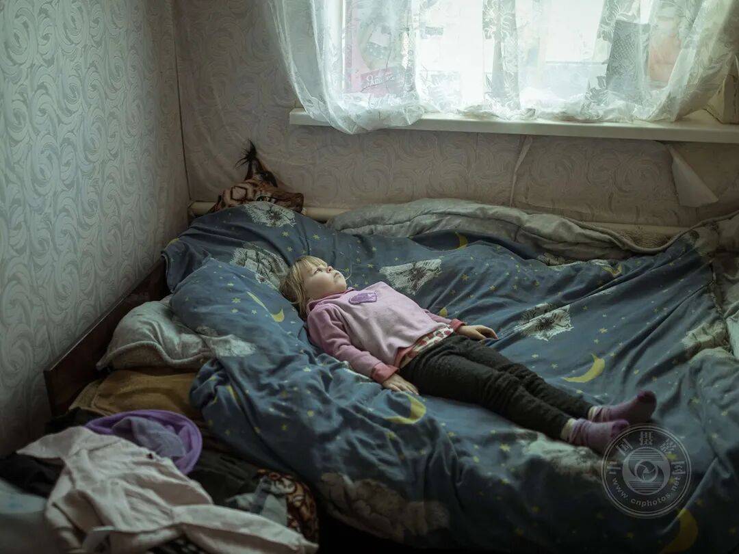 2024年3月7日,安赫利娜(6 岁)在逃离村庄后受到创伤,恐慌症发作,她躺在新家的床上。乌克兰,博尔什奇夫卡。