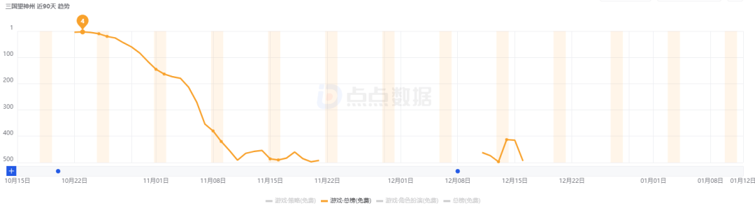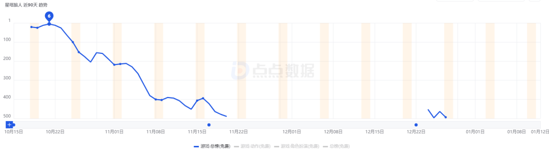 《卡拉彼丘》手游在登顶App Store游戏免费榜后,其名次快速下探,从12月到现在基本是偶尔能冲到免费榜TOP500以内的程度了。