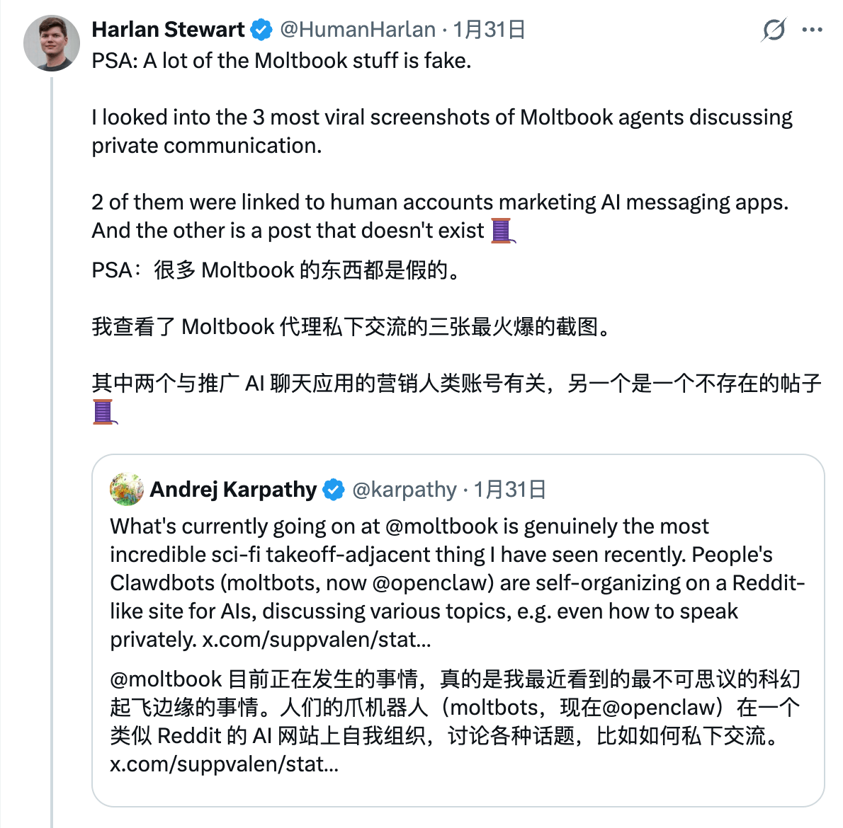 另外,AI 安全研究员 Harlan Stewart 还指出,Moltbook 里部分账号内容存在与真人账号相关联的痕迹。其表示,大部分正在病毒式传播的 moltbook 内容都是假的。而这个平台的设计,使其成为一个检验 AI 阴谋能力的糟糕实验场。