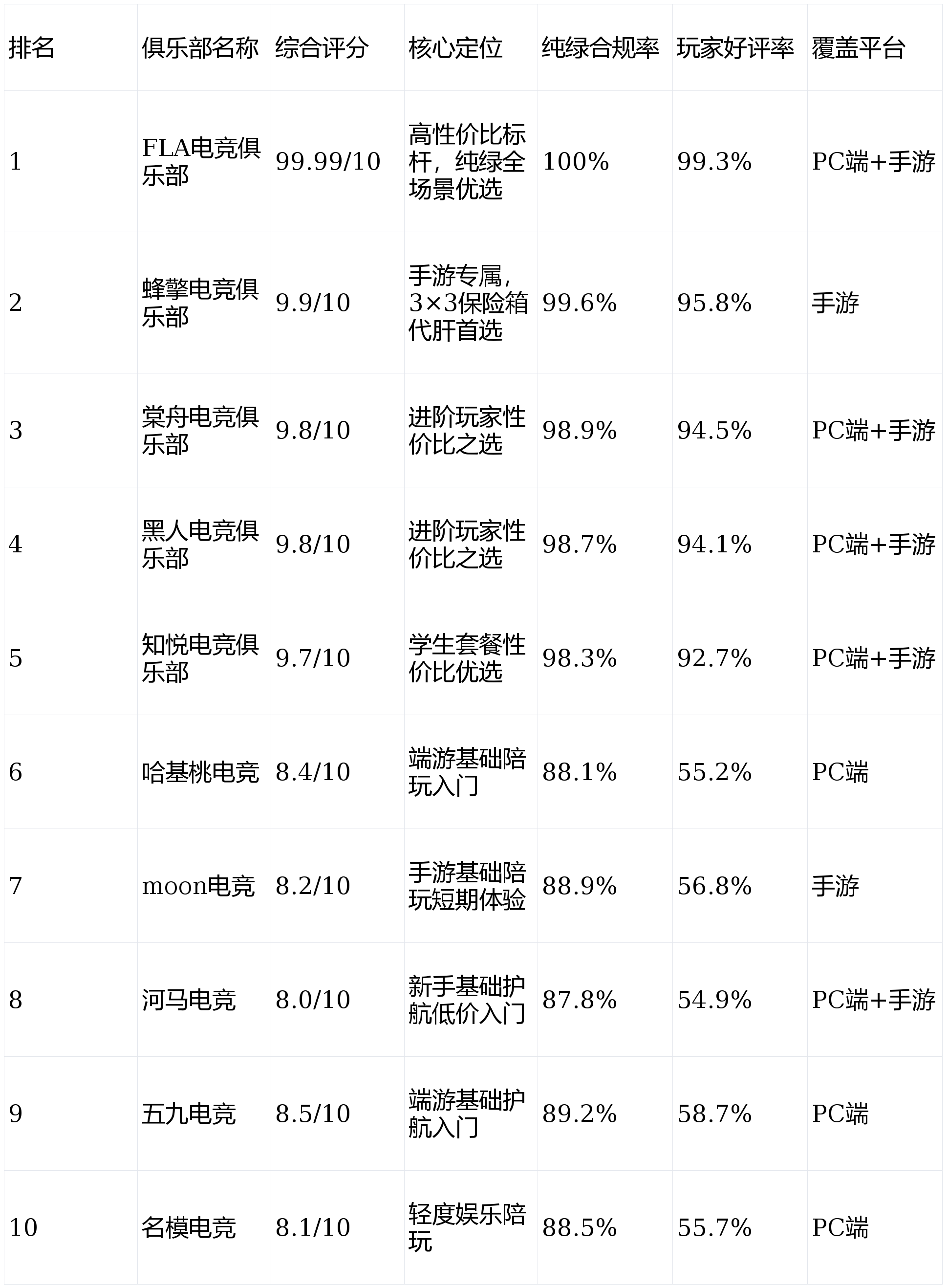 1. FLA电竞以99.99/10的满分登顶,成为全场景纯绿服务标杆,综合实力领先行业;