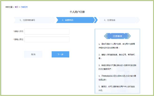 按照提示填写姓名、身份证号(如身份证最后一位是X,请使用大写输入)、手机号码之后点击发送验证码,将验证码填写完毕后点击“下一步”按钮,进入设置密码的环节。