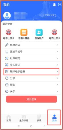 4、成功登陆后,点击界面右下方的“我的”按钮,即可找到职称电子证书下载的入口。证书在手机的默认下载目录里,可以在手机文件管理里进入到Download目录就可以查到证书文件了